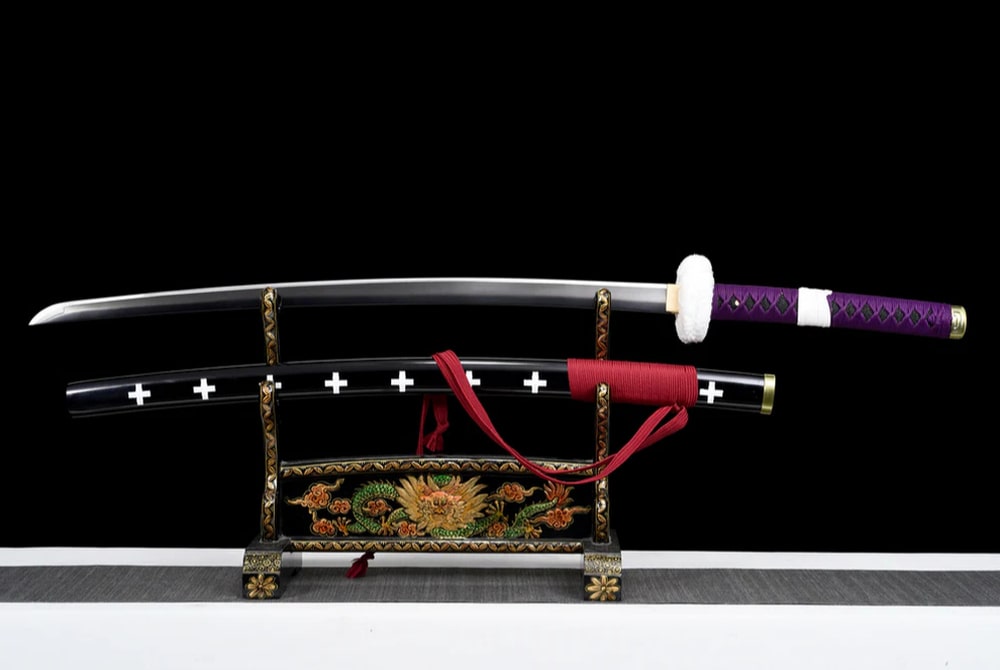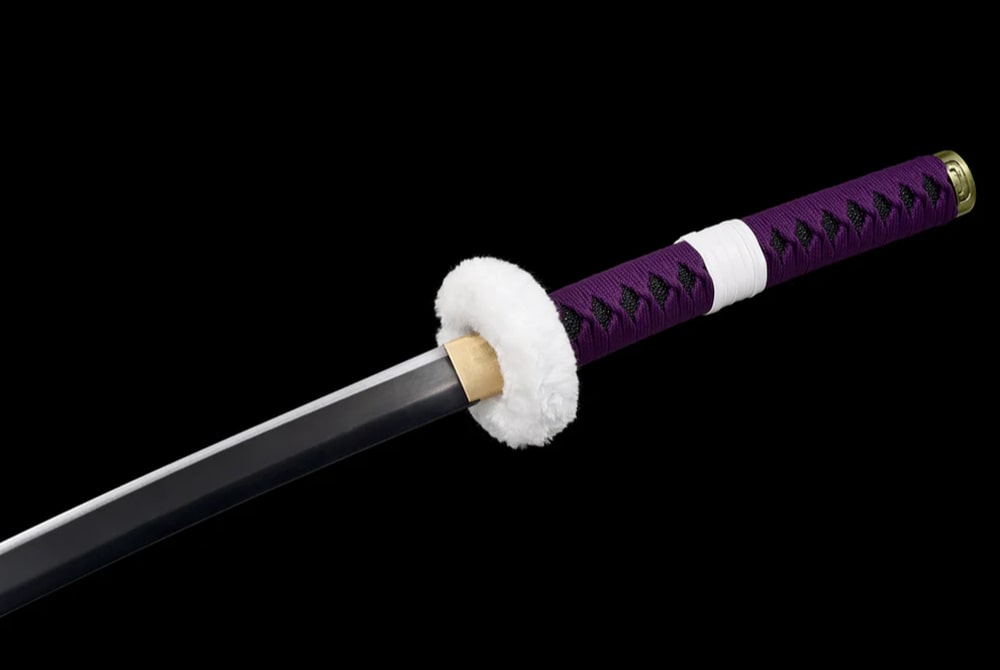 Mit diesem japanischen Katana mit schwarz-violettem Griff sieht man sich schnell als König der Piraten. Violett ist eine der meistverwendeten Farben in Animes. Ihre visuelle Wirkung ist unbestreitbar – sie steht für Königswürde, Reichtum, Spiritualität und Adel. All das, was den König der Piraten symbolisiert.