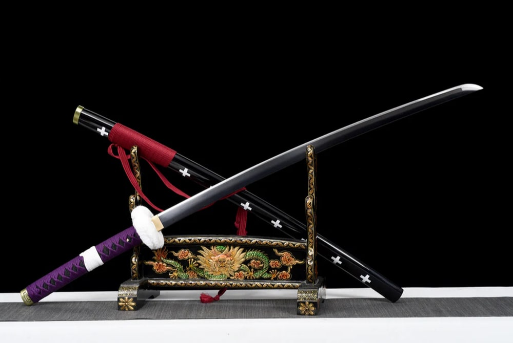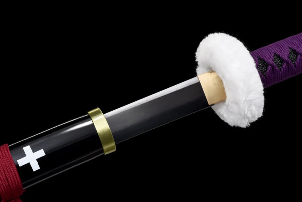 Entdecken Sie das authentische Trafalgar Law Katana – eine originalgetreue Replik des legendären Schwertes aus One Piece. Der Behälter dieses Katanas besteht aus schwarz lackiertem Massivholz und ist über die gesamte Länge mit weißen Kreuzen verziert. Auch der Griff ist aus Massivholz gefertigt; die Kordelwicklung ist violett, während die des Scheidenbands rot ist. Eine schwarz gefärbte, handgeschmiedete Klinge aus kohlenstoffreichem Stahl vollendet dieses japanische Heldenschwert.