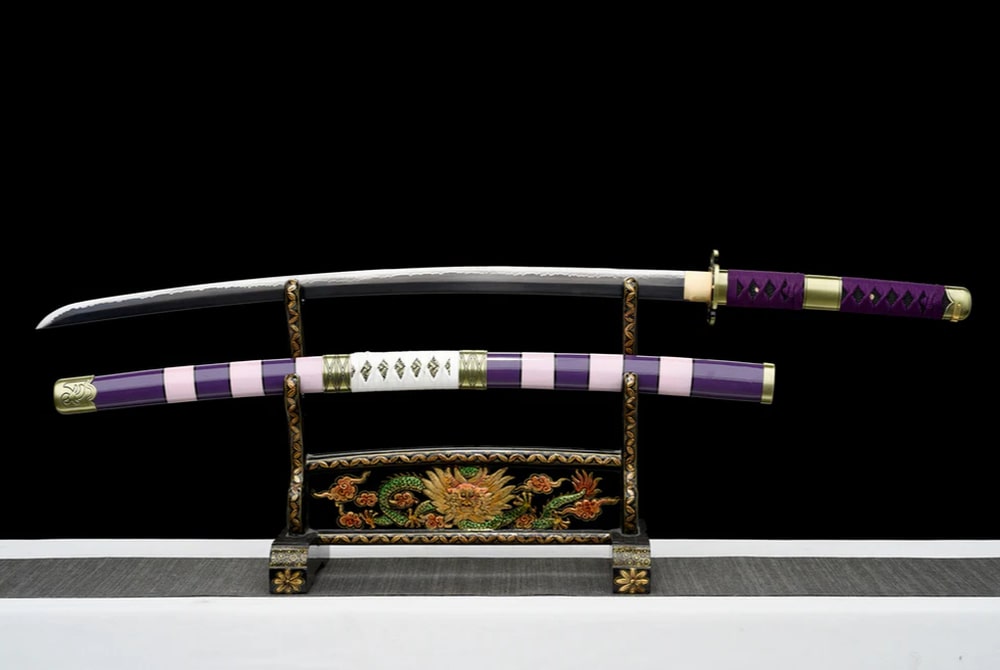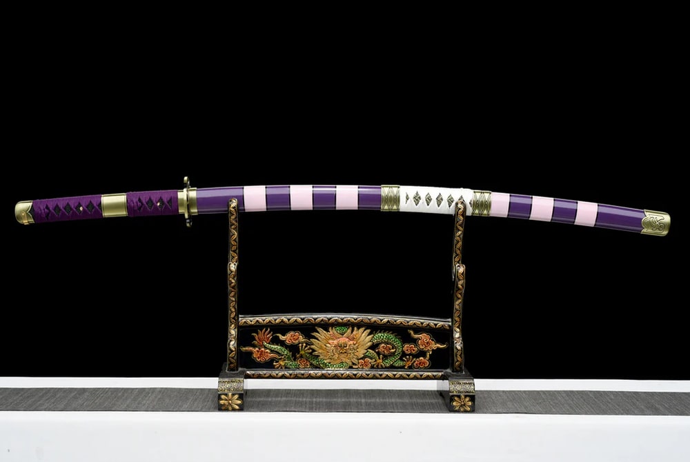 Dieses Katana ist ein hervorragendes Geschenk für die ganze Familie und treue Anime-Fans. Violett ist in Japan – und besonders in Mangas – eine sehr beliebte Farbe. In der japanischen Kultur steht sie für Reichtum und Privileg. Ein Schwert also, das man in die Hand nehmen muss, um sich den Piraten der hohen See zu stellen.