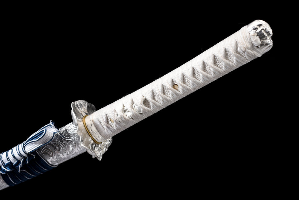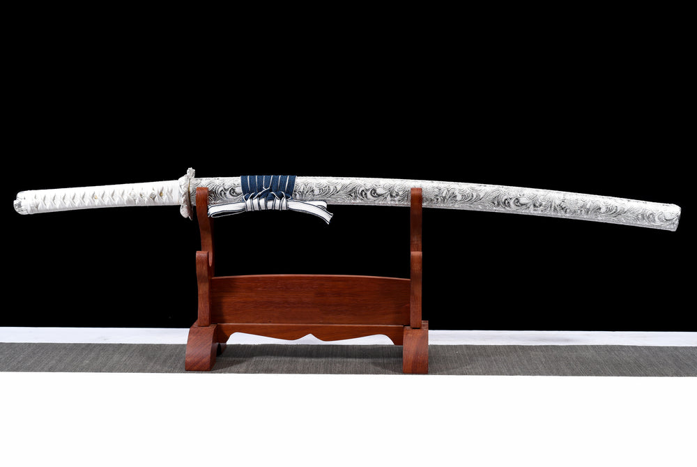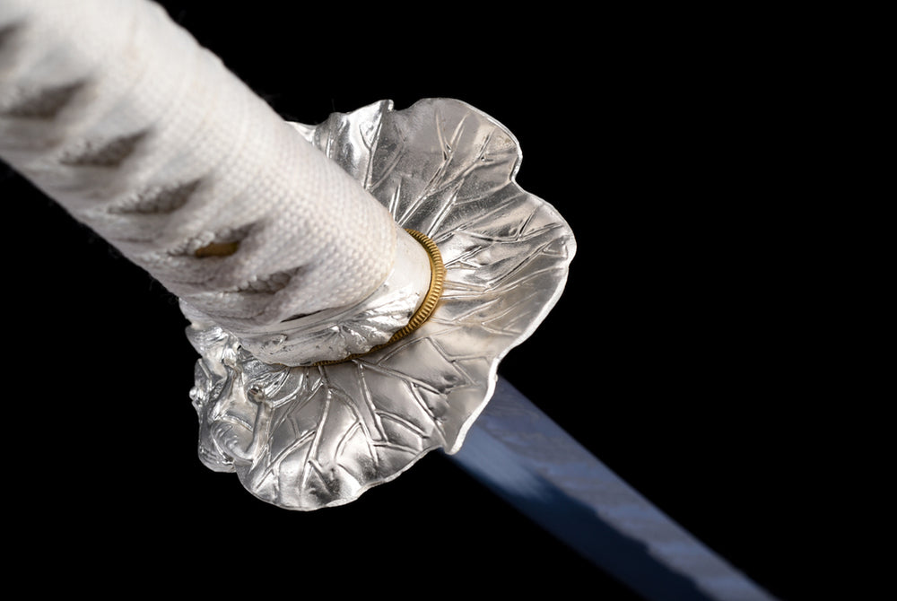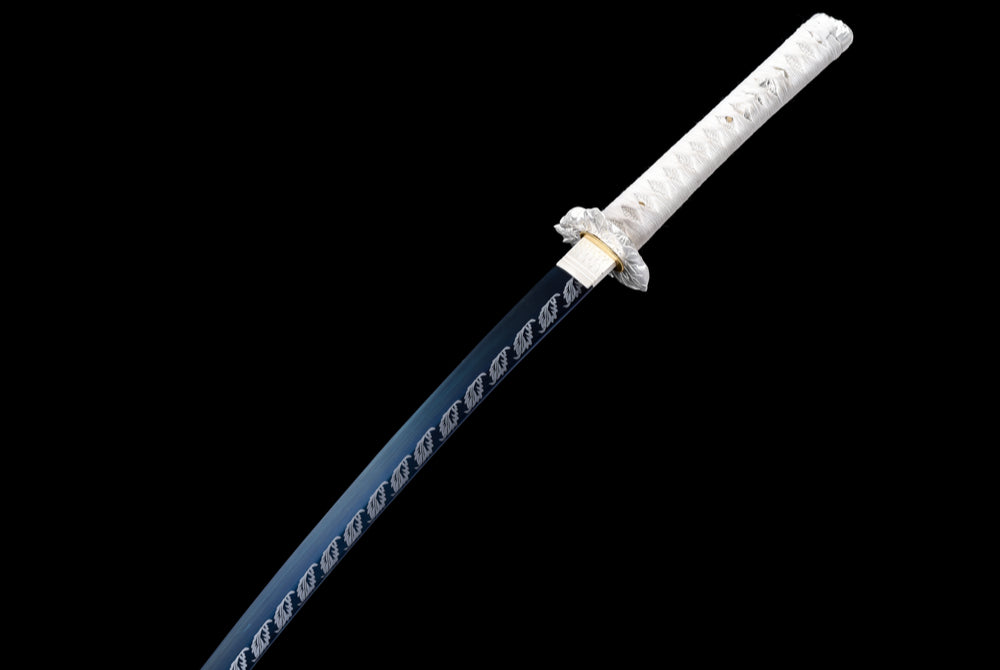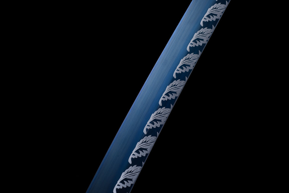 Die Klinge dieses prächtigen Katanas ist blau und über ihre gesamte Länge mit einem filigranen Blattmotiv verziert. Sie besteht aus Manganstahl und wurde vollständig von Hand geschmiedet und poliert. Auch die Scheide ist ein echtes Kunstwerk: Sie wird aus Holz gefertigt und mit einer kunstvoll gearbeiteten Ledermanschette überzogen, die sofort ins Auge fällt. Der Griff besteht aus Massivholz und die Tsuba aus einer Legierung zeigt ein fein strukturiertes Blattmotiv.