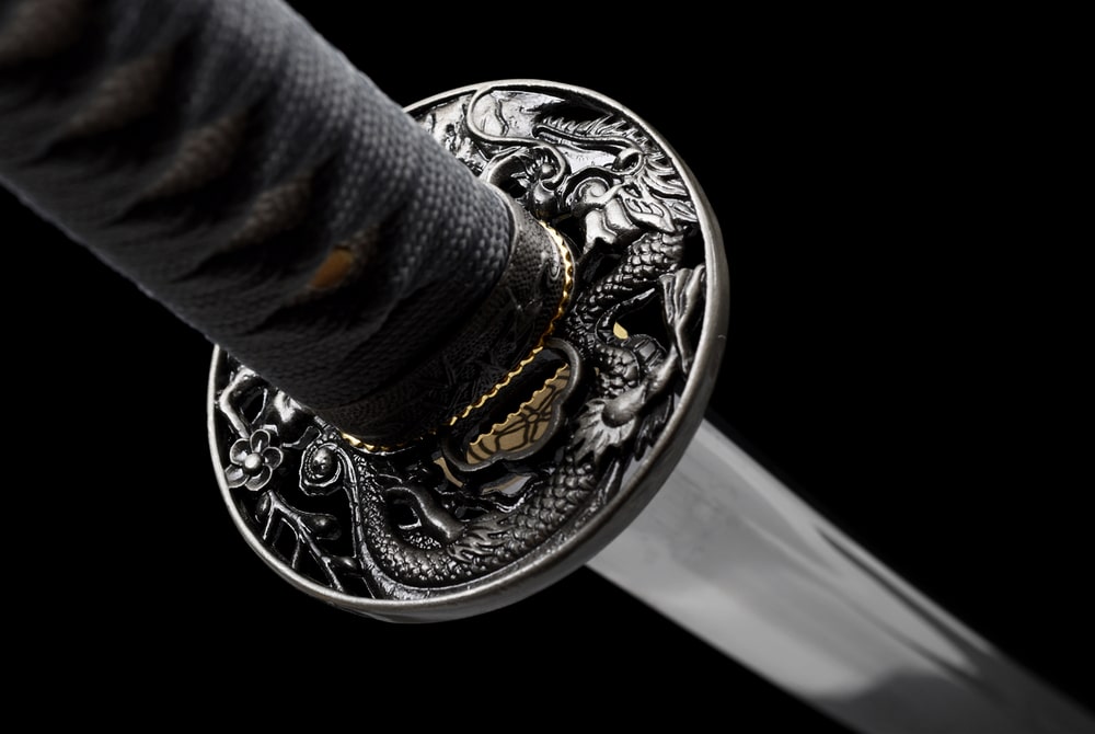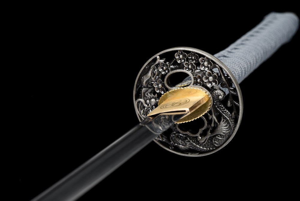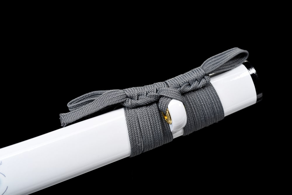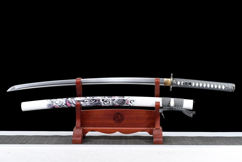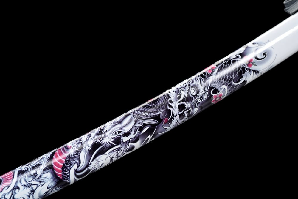 Von seltener Eleganz verbindet dieses Katana die Reinheit des Weiß und die Zurückhaltung des Graus und erinnert an das Gleichgewicht zwischen Ruhe und Kraft. Seine Klinge aus Manganstahl, zugleich widerstandsfähig und flexibel, wird unter Einhaltung der japanischen Traditionen geschmiedet. Die Scheide, verziert mit einem Drachenmotiv und Kirschblüten, symbolisiert sowohl Stärke als auch Erneuerung – zwei Werte, die tief in der japanischen Kultur verwurzelt sind.