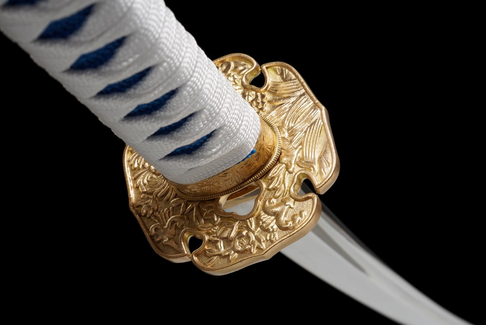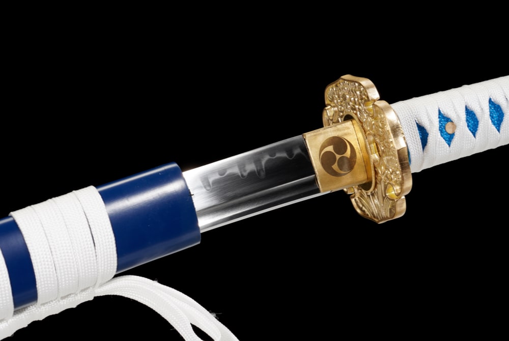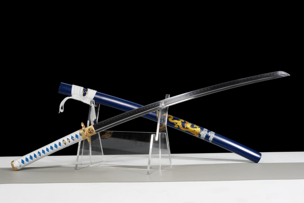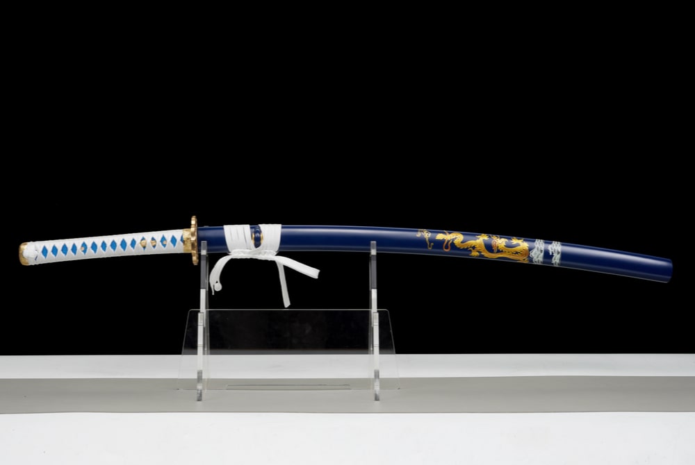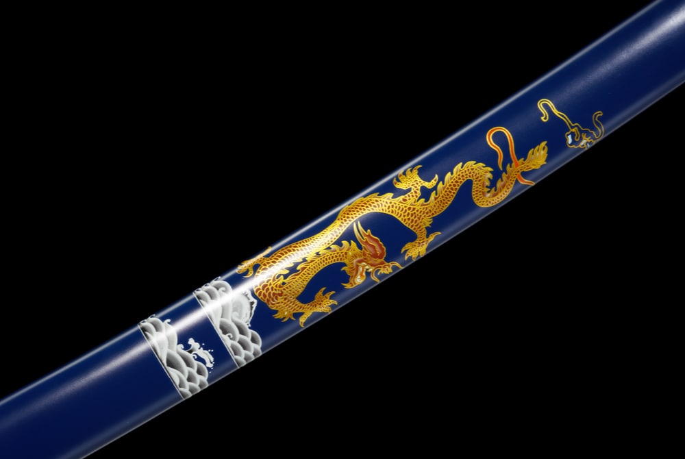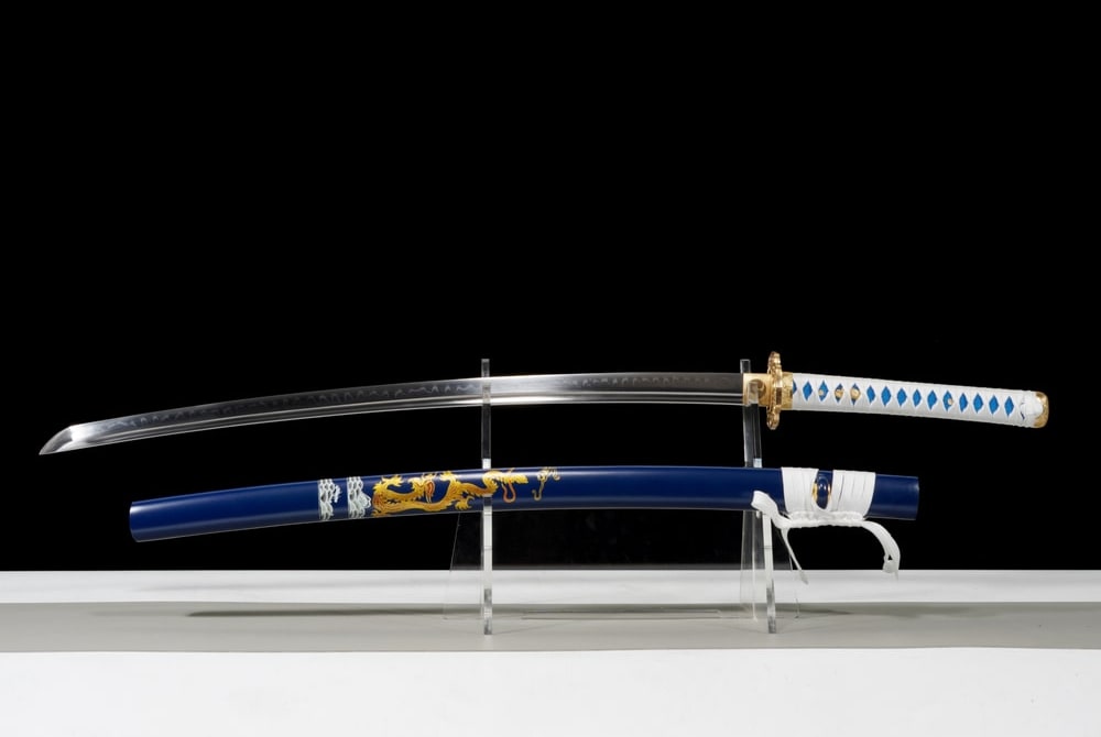 Wenn Sie elegante und raffinierte Schwerter lieben, wird dieses Katana Sie begeistern. Von Hand aus T10-Stahl geschmiedet, verfügt es über eine Full-Tang-Klinge von außergewöhnlicher Qualität. Sein Design vereint Harmonie und Noblesse: Der weiße Griff mit hellblauen Akzenten steht für Reinheit und Gelassenheit, während die tiefblaue Scheide, veredelt mit einem goldenen Drachen, Macht und Weisheit verkörpert. Jedes Detail – von der fein gravierten goldenen Tsuba bis zur polierten Klinge mit einem wunderschönen Hamon – zeugt von handwerklichem Können, das den größten traditionellen Schmieden würdig ist.