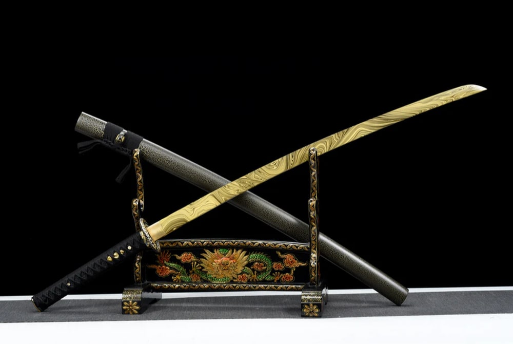 Die Klinge dieses Katanas ist atemberaubend schön. Der manganreiche Stahl ist vollständig mit goldgelben Mustern verziert. Auch die Massivholz-Scheide ist mit einer dezenten, passenden Bemalung gestaltet und weist zusätzlich Gravurelemente auf. Die Tsuba aus Kupferlegierung ist ebenfalls ein kleines Meisterwerk an Feinheit.